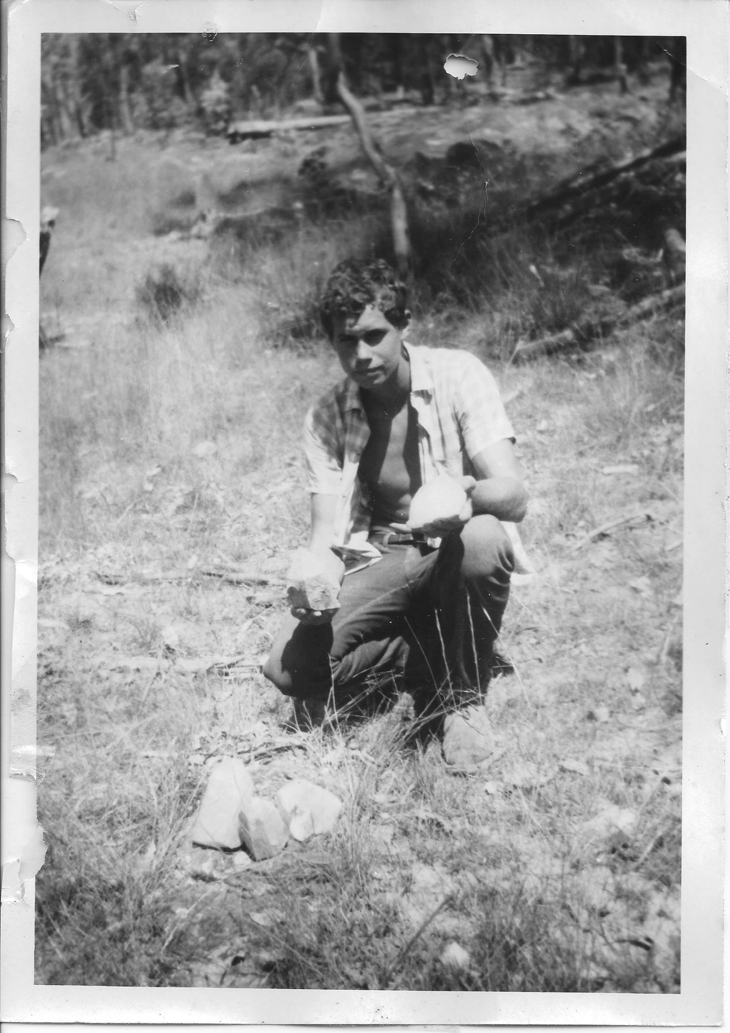 Here is a great picture of Australian collector/miner Dehne MacLaughlin, taken in 1966 at Allies Mine, Deepwater, NSW, Australia. Dehne is showing off some quartz crystals recently collected.