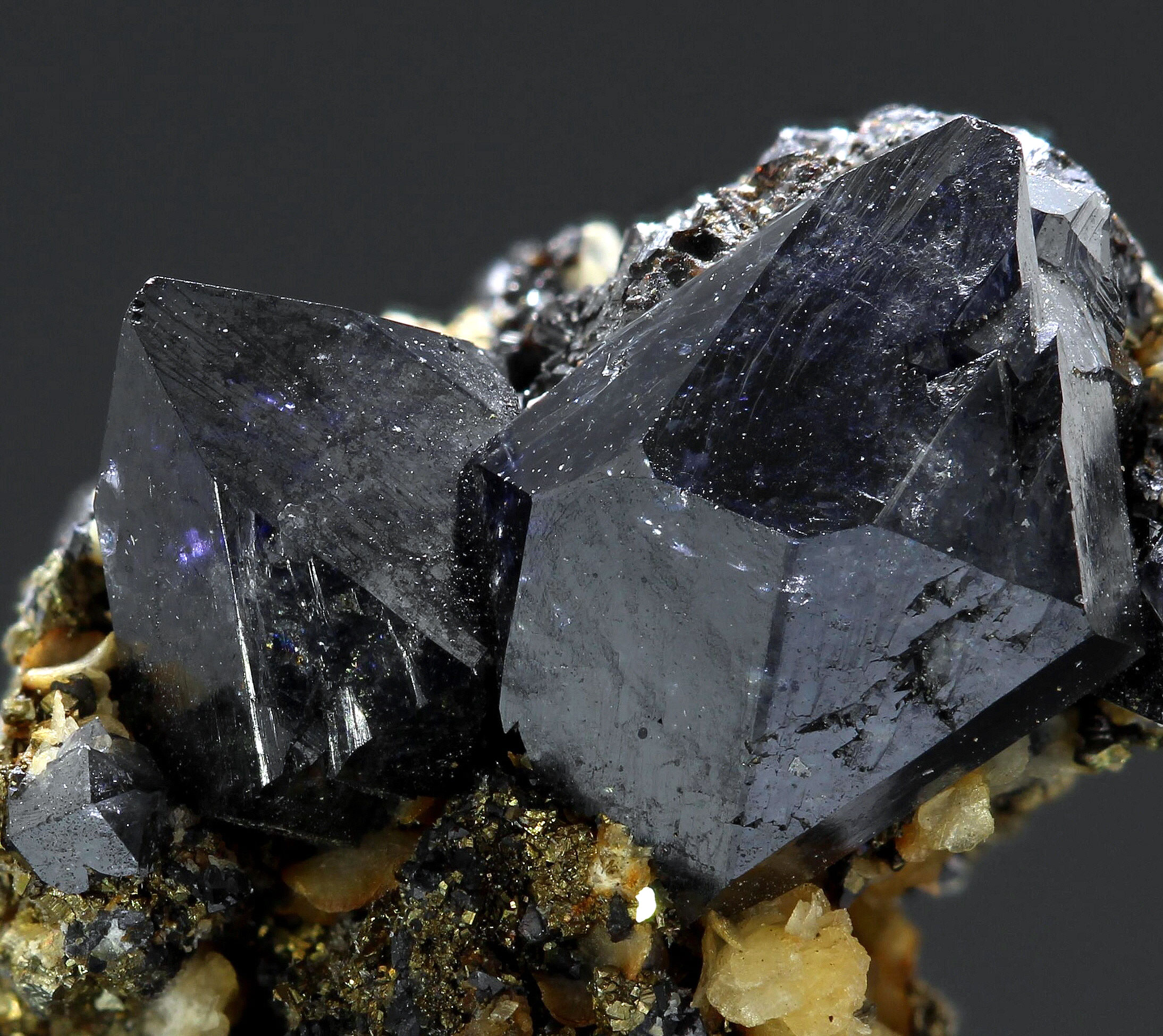This little specimen is very typical with deep gemmy blue octahedral crystals to 7mm deposited on sphalerite/chalcopyrite with strangely contorted "sinusoidal" calcite.