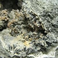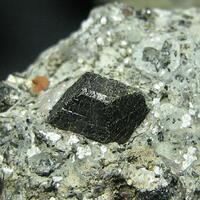 8. Nepheline: white prismatic crystals with vonsenite metal needles and orange titanite, Onano, Viterbo, Lazio, Italy;